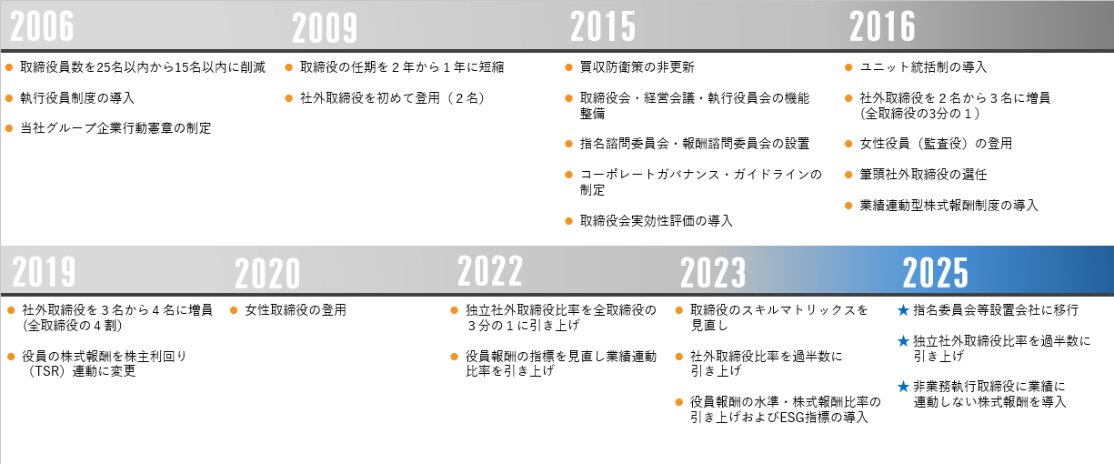 当社は、2009年に社外取締役を複数名選任するなど、持続的な企業価値の向上とコーポレートガバナンス改革を結び付けて、積極的にガバナンス体制の整備を推進してきました。今後も社内でガバナンス体制に関する議論を深め、着実にガバナンス改革を深化させていきます。