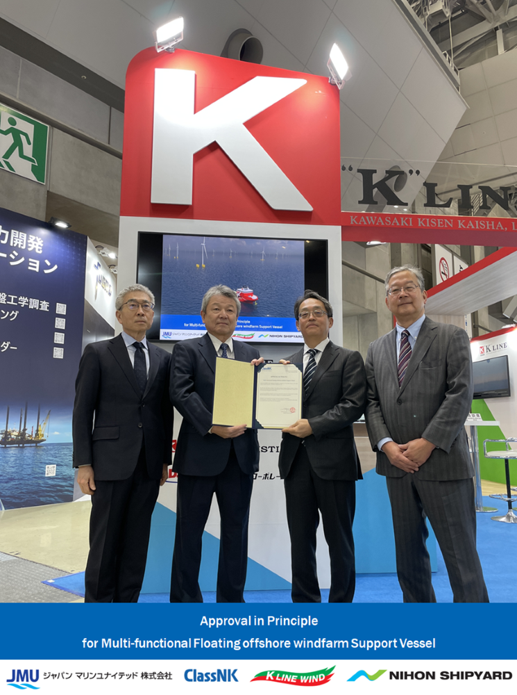 川崎汽船株式会社と川崎近海汽船株式会社の合弁会社であるケイライン・ウインド・サービス株式会社(本社:東京都千代田区、代表取締役社長:蔵本輝紀)、ジャパンマリンユナイテッド株式会社(本社:神奈川県横浜市、代表取締役社長:灘 信之)、日本シップヤード株式会社(本社:東京都千代田区、代表取締役社長:前田明徳)は、浮体式洋上風車向け専用船構想に係るAiP認証(注1)を、一般財団法人 日本海事協会(本部:東京都千代田区、会長:坂下 広朗)より取得致しました。