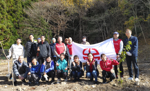 本活動では、利根沼田森林組合の協力の下、以前より里山保全活動で協力関係にあったNPO法人千葉大学環境ISO学生委員会との協働で、合計15名が参加して、約2.5haの土地の一部に80本の植林を実施しました。尚、植樹にあたっては、従来から当地にあった樹種を選定しています。