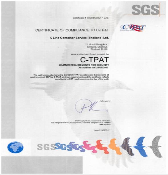 KCST社は1989年設立以来、地域密着型の高品質物流サービスを提供して参りました。2015年にはレムチャバン港の近郊にコンテナデポ、トラックデポ、倉庫を集約した最新鋭の物流センター(K Line Bang Phra Logistics Center)を新規開設し、現在はタイ国内で4拠点を有する総合物流企業となっております。同社はお客様よりお預かりする貨物の「安全品質」確保に着目し、その品質の証明となるISO28000及びC-TPAT認証取得に向けて、従業員一丸となって取り組んで参りました。
