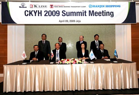 CKYHアライアンス(メンバー:コスコン、川崎汽船、陽明海運、韓進海運)は4月9日、韓国済州島にて2009年サミット会議を開催しました。今回の済州島におけるサミット会議は昨年の沖縄に続く第7回目のCKYHサミット会議となります。